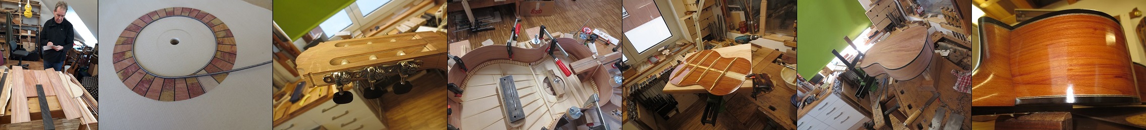 Classico Šljiva Nach einem ersten Gespräch und dem Anspielen der Olivengitarre auf dem Guitar Summit 2017 waren wir dann im Dezember bei Gitarrenbaumeister Jens Schönitz in seiner Werkstatt in Erlangen und haben die Hölzer für mein ganz persönliches Trauminstrument ausgesucht. Daraus hat Jens in den folgenden 11 Monaten eine wunderbare Gitarre erschaffen und das Projekt vorbildlich in Bildern festgehalten, die uns über den Stand der Arbeiten informierten. [Fotostrecke] Boden, Zargen, Kopfplattenlaminat und Rosette wurden aus serbischer Zwetschge (Šljiva) gearbeitet, die Decke aus Alpenfichte. Der Hals ist aus Cedro, alle Sperrungen und das Binding aus Ebenholz, Wenge und Ahorn. Das Griffbrett haben wir ebenfalls aus Ebenholz ausgesucht, der Steg wurde als einzige regulierte Holzart aus altem Palisander aus Beständen eines ortsansässigen Gambenmachers gearbeitet. Die Mechaniken in puristischer, durchbrochener Ausführung stammen von Gotoh aus Japan und mussten in Kanada beschafft werden, die Knöpfe sind ebenfalls aus Ebenholz. Die Rückseite des Halses ist gewachst, Boden, Decke und Zargen mit feinstem Schellack veredelt. Das Konzept des Instrumentes ist eine moderne Interpretation des Themas Konzertgitarre mit vielen und aufwändigen aber nicht verspielten Details, klaren Linien und einem strukturierten, ruhigen Aufbau. Die flammende, wilde Zwetschge wird durch schwarzes Binding und Sperrungen sowie harte Abgrenzungen gebändigt. Auf diesem Fundament ruht mit unaufgeregter, schlichter Reinheit die Alpenfichte, nur die Rosette erzählt mit ihren fremdartigen Schriftzeichen und landkartenähnlichen Strukturen die Geschichte der Urkraft des Zwetschgenfeuers tief unter ihr. Auch das Ebenholzgriffbrett und die Knöpfe der schlichten, nicht verzierten Mechaniken, die dem Instrument ein Hauch von japanischem Zen schenken, tragen zur Kontrolle der Strukturen bei und beruhigen das Auge, wenn es sich wieder einmal auf einen Ausflug in die rot-violette Welt der serbischen Zwetschge gewagt hat. Genug der Dilettanten-Poesie, zu den klanglichen Eigenschaften muss ich schweigen, denn hier fehlen mir die Worte. Belassen wir es bei "schön", "grandios", "süßlich singend" und vielleicht "berührend"... |