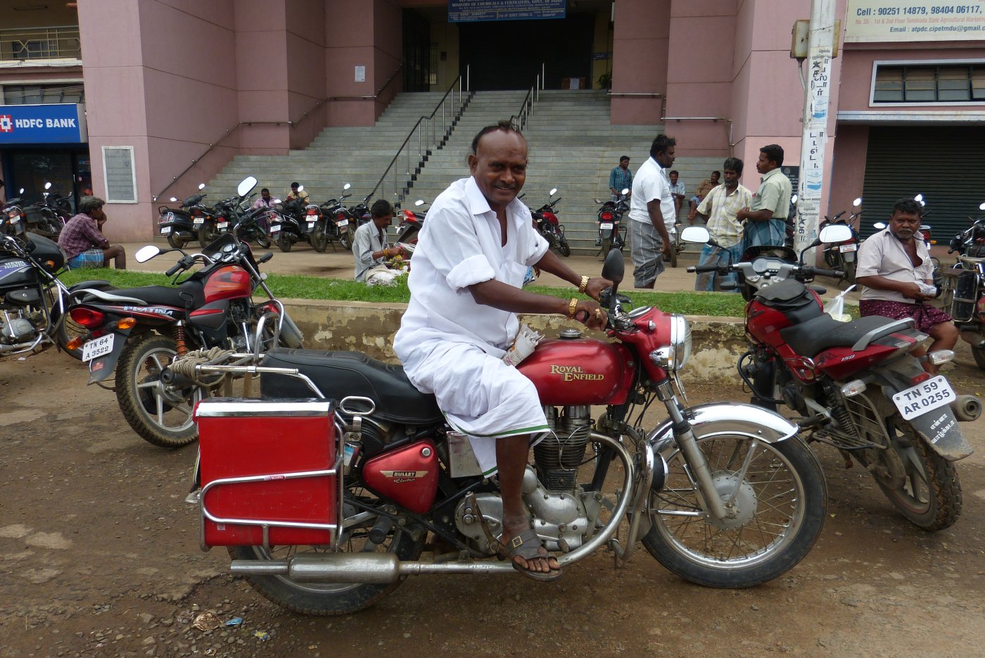 stellvertretend für den Enfield-Kalender 2015: Stolzer Besitzer einer Electra auf einem Blumengroßmarkt bei Madurai