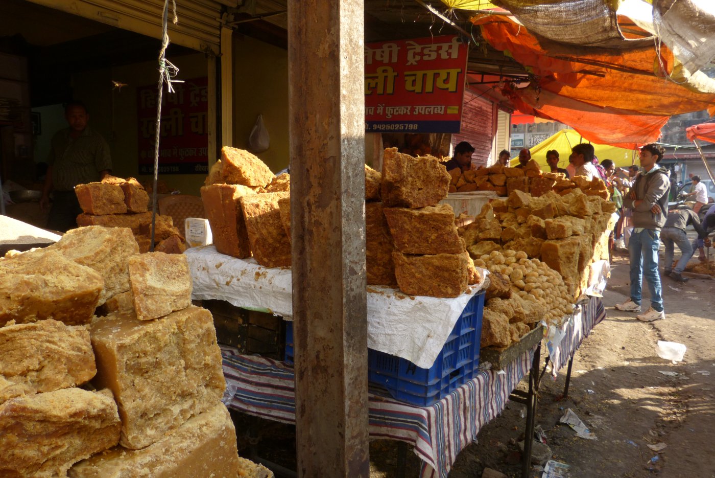 Jaggery (unrafinierter Rohrzucker) auf dem Markt in Bhopal